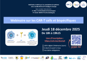 Nous vous donnons rendez-vous le jeudi 18 décembre de 18h00 à 19h15 pour un Webinaire organisé par le CRI-IMIDIATE, FAI²R et les associations de patients partenaires sur les CAR-T cells et bispécifiques : comment passer de la paillasse au médicament pour les patients ? Comment se sont développées ces thérapeutiques, quelles sont leurs actions sur le corps pour bloquer le processus auto-immun ?