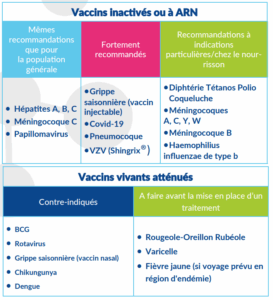 Pour le vaccin DTP (Diphtérie Tétanos Polio), les hépatites ou encore le papillomavirus, les recommandations vaccinales sont les mêmes que pour la population générale.